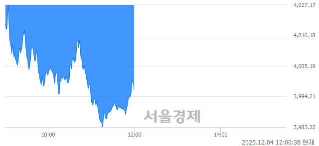 4일 오후 12시 0분 현재 코스피는 전일 대비 39.22p(-0.97%) 내린 3997.08로, 41(매도):59(매수)의 매수우위를 기록 중이다.