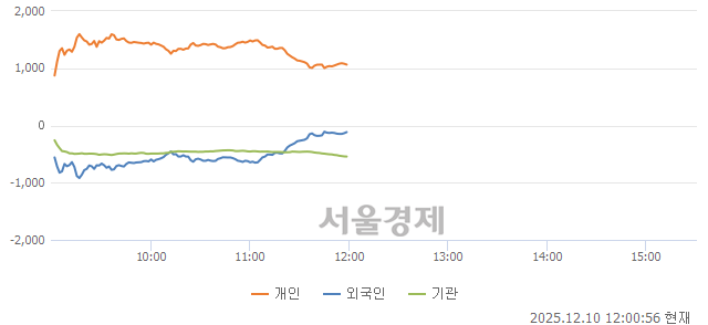 투자자별 동향을 살펴보면, 개인이 홀로 매수 포지션을 취하고 있는 반면, 외국인과 기관은 동반 매도세를 보이고 있다. 개인은 1,076억을 순매수 중이며, 외국인은 124억, 기관은 548억을 각각 순매도하고 있다.